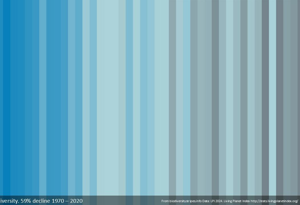 These ‘ocean stripes’ are a stark reminder that we are losing life in our seas at an alarming rate, and a call to take urgent action. Drawn from the latest Living Planet Index (LPI) data from 2024, the stripes symbolically show we have lost 59% of marine wildlife populations since 1970. Given that the ocean – covering over 70% of the Earth’s surface – harbours more than 80% of biodiversity on the planet, this staggering decline should ring alarm bells.